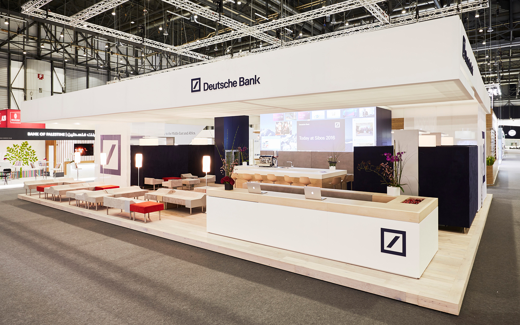 Seit 2006 gestalten wir den Gesamtauftritt der Deutschen Bank / Global Transaction Banking bei unterschiedlichen Messen und Veranstaltungen. In einem durchgehend kooperativen und zielorientiertem Prozess hat sich nicht nur ein tiefes Vertrauen entwickelt, sondern auch ein außergewöhnlich durchdringendes Verständnis für das, was die Bank ausmacht, ihre Werte, Ziele, ihre DNA. Die Entwicklung der letzten elf Jahre hat die Bank grundsätzlich verändert – diese Veränderung haben wir begleitet, in den Raum getragen und erlebbar gemacht. Das Produkt, die Botschaft eines Dienstleisters, lässt sich am ende nur durch Atmosphäre transportieren. Die Atmosphäre muss Besucher aufnehmen, einbetten und einen Rahmen schaffen, der die Auseinandersetzung mit den intendierten Themen auf angenehme Weise begünstigt.
